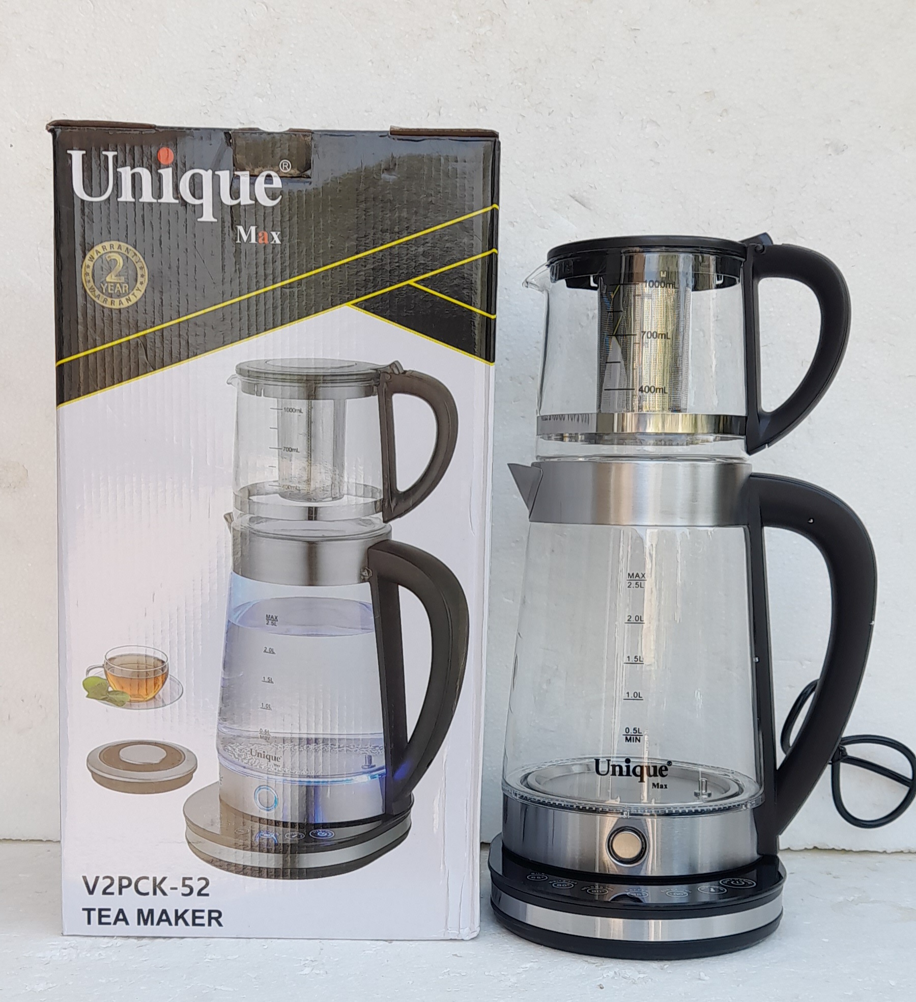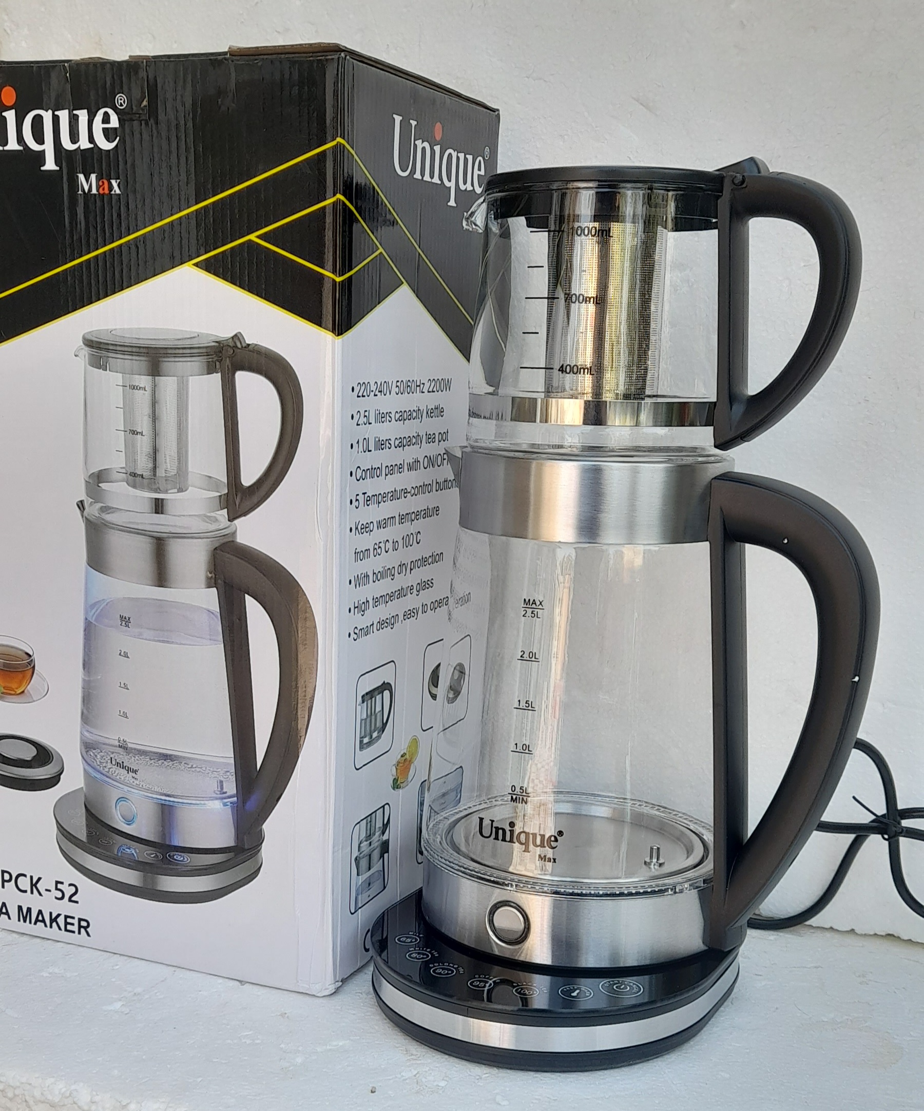 چای ساز یونیک. دیجیتال تمام لمسی . گرمکن دار پیرکس کتری بزرگ. ۲ نیم لیتری. قوری دمنوش ساز نگهدارنده دما به دمای دلخواه قطع کن خودکار